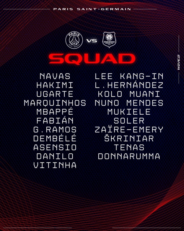 巴黎法國杯對雷恩大名單:姆巴佩、登貝萊在列,馬爾基尼奧斯回歸